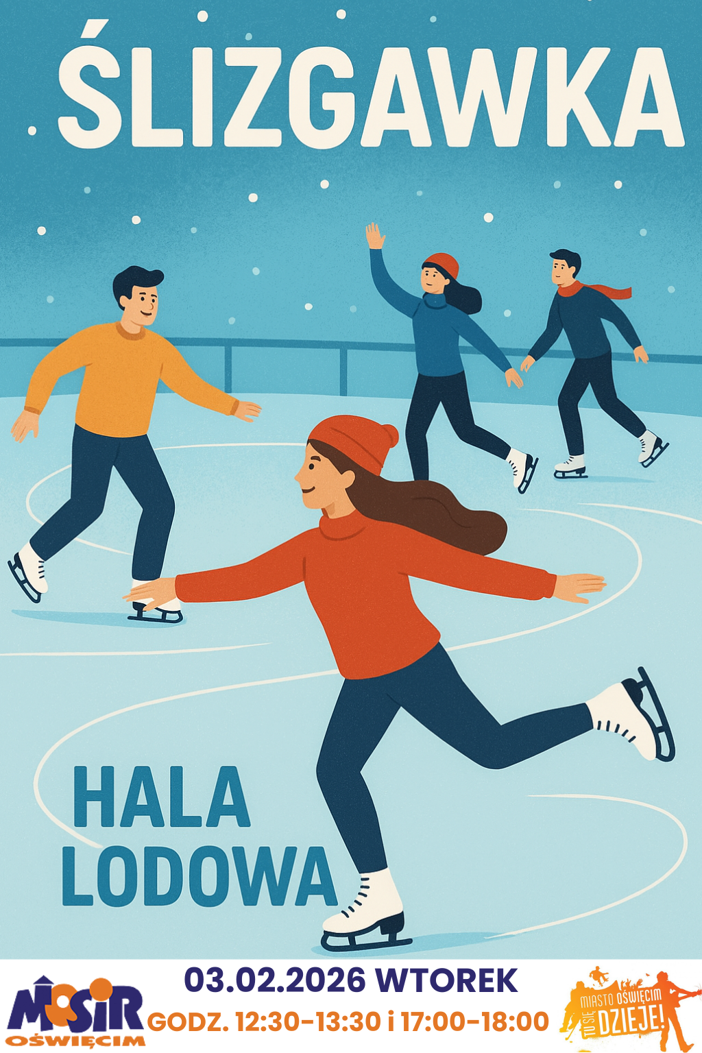 Miejski Ośrodek Sportu i Rekreacji w Oświęcimiu zaprasza na ślizgawkę, która odbędzie się 3 lutego w godzinach od 12:30-13:30 oraz 17:00-18:00 na Hali Lodowej, przy ul. Chemików 4.
