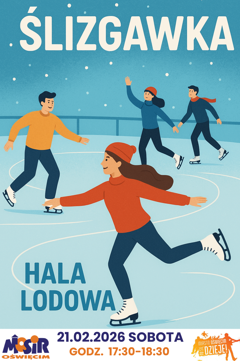 Miejski Ośrodek Sportu i Rekreacji w Oświęcimiu zaprasza na ślizgawkę, która odbędzie się 21 lutego w godzinach od 17:30-18:30 na Hali Lodowej, przy ul. Chemików 4.