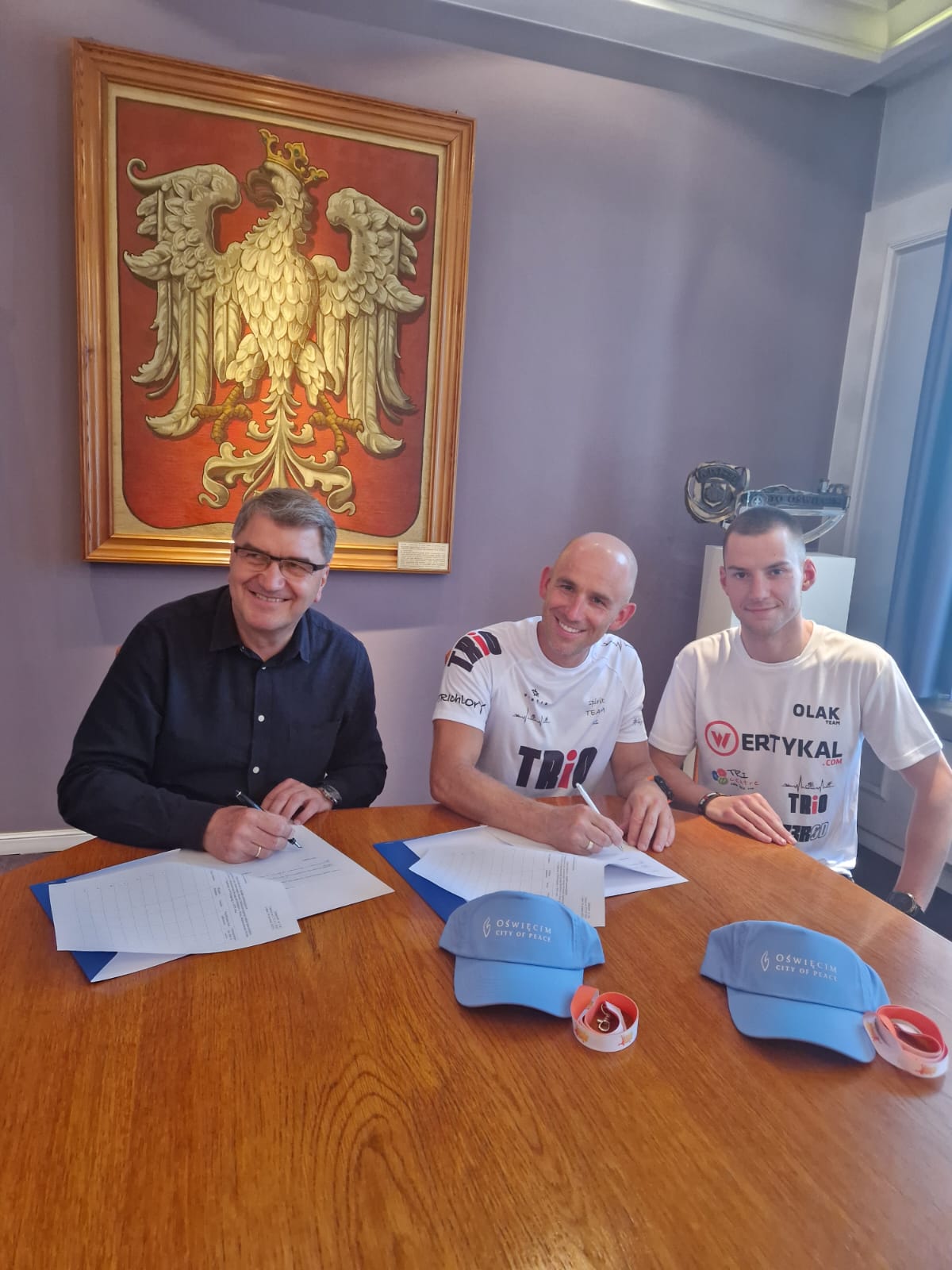 Triatloniści spotkali się w urzędzie z prezydentem Oświęcimia Januszem Chwierutem. Przedstawili włodarzowi miasta swoje plany związane z udziałem w prestiżowych zawodach triathlonowych rangi mistrzostw świata. Piotr Olak będzie reprezentował Polskę oraz miasto Oświęcim podczas Mistrzostw Świata IRONMAN, które odbędą się we francuskiej Nicei. Z kolei Patryk Flieger wystartuje w Mistrzostwach Świata w Triathlonie, które zostaną rozegrane w Australii w Wollongong.