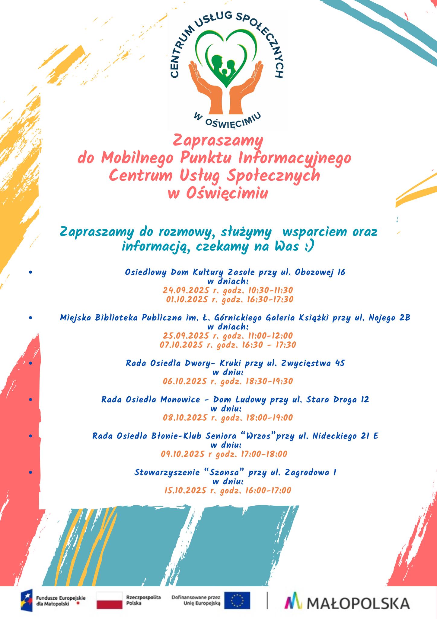 Mobilny Punkt Informacyjny Centrum Usług Społecznych pojawi się w różnych miejscach w Oświęcimiu. W ten sposób pracownicy instytucji, która powstała niedawno na bazie Miejskiego Ośrodka Pomocy Społecznej chcą zapoznać mieszkańców z działalnością Centrum Usług Społecznych, powiedzieć o dostępnych formach usług i wsparcia dla oświęcimian.