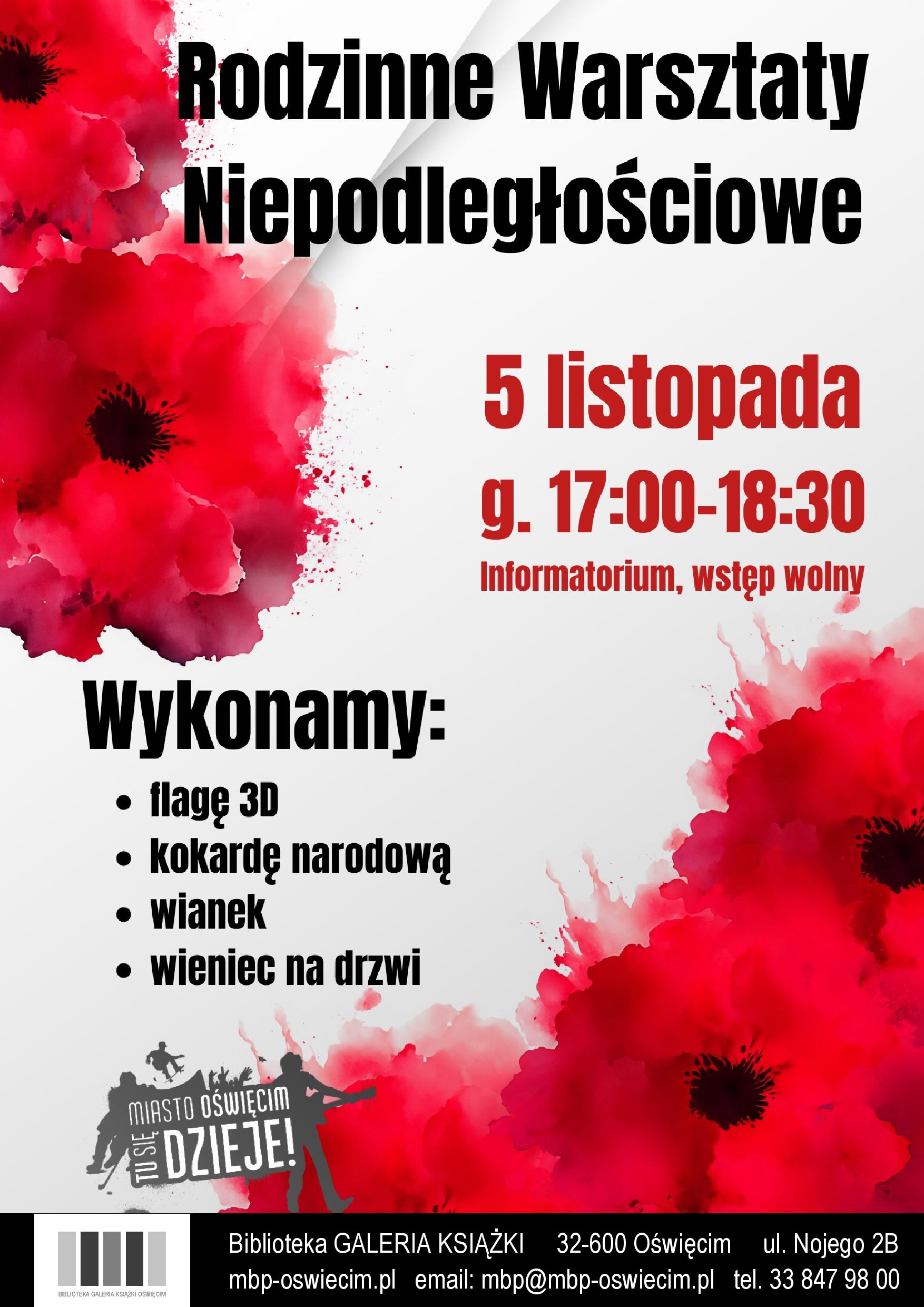 Zapraszamy na Rodzinne Warsztaty Niepodległościowe, na których wykonamy : flagę 3D, wianek, kokardę narodową i wieniec na drzwi. Warsztaty odbędą się 5.11.2025 roku w Informatorium Biblioteki o godz. 17.00.